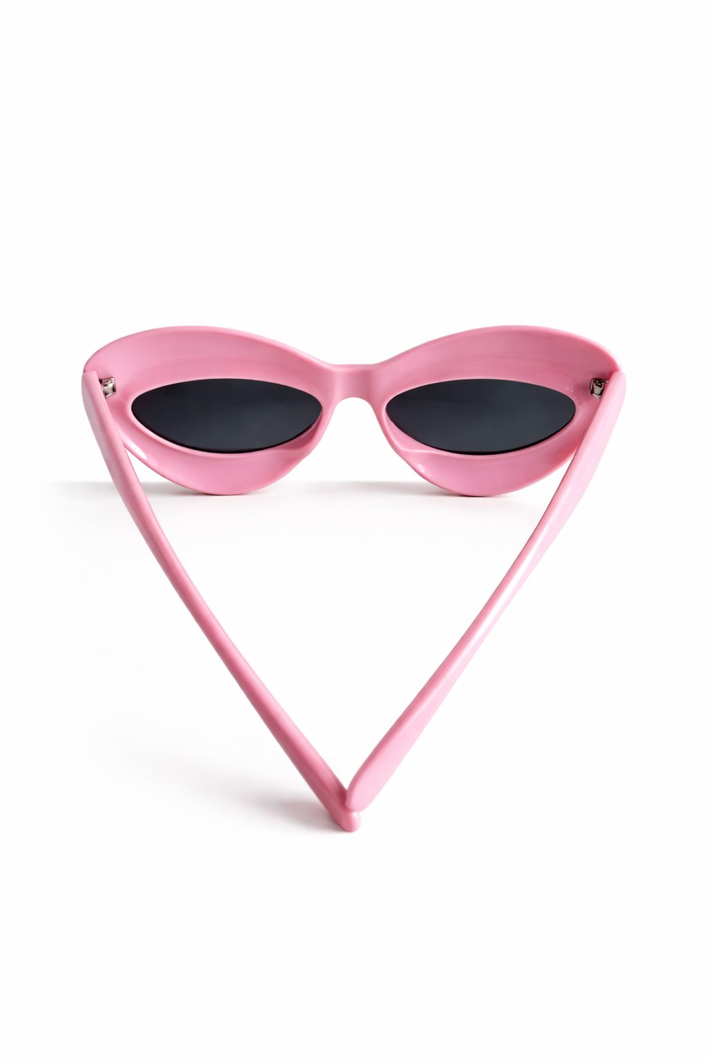 Sculptural pink cat-eye sunglasses with an oversized, fluid silhouette, high-gloss finish, thick molded frame, deep dark lenses, bold contemporary design, statement eyewear piece.”